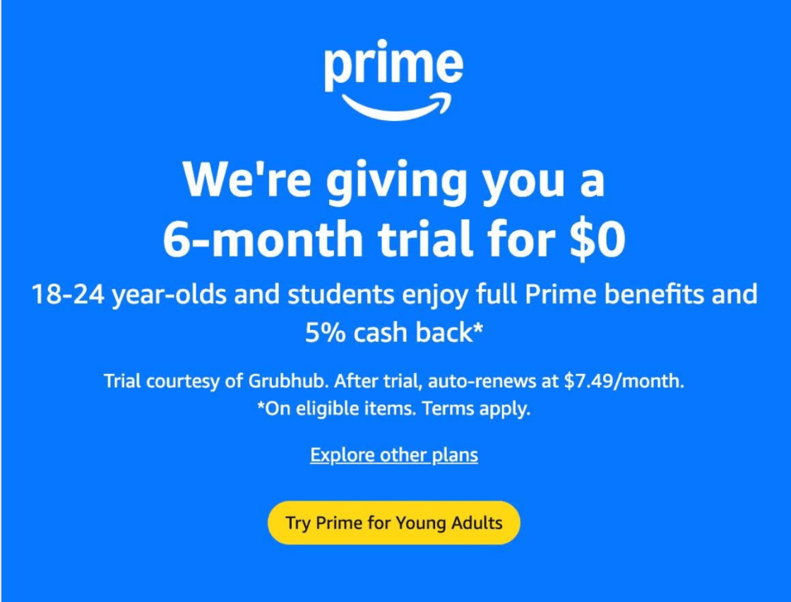 Set those college kids and recent grads up for success—by giving them the gift of their own Prime account (and finally getting them off yours 😂). Prime Young Adult is where it’s at👇 They get a huge free trial, then it’s half the cost of a regular membership. No student ID needed—just be under 26 and know how to reheat leftovers. Bonus: they’ll earn 5% cash back on eligible items (or 10% with the Prime Card), and during Prime Day they score 10% back on special deals. 🤑 All the perks: Prime Video, Grubhub, exclusive deals, and most importantly… independence. (You will have to be signed out of an existing prime account to see and sign up for the offer)